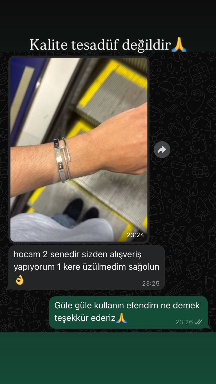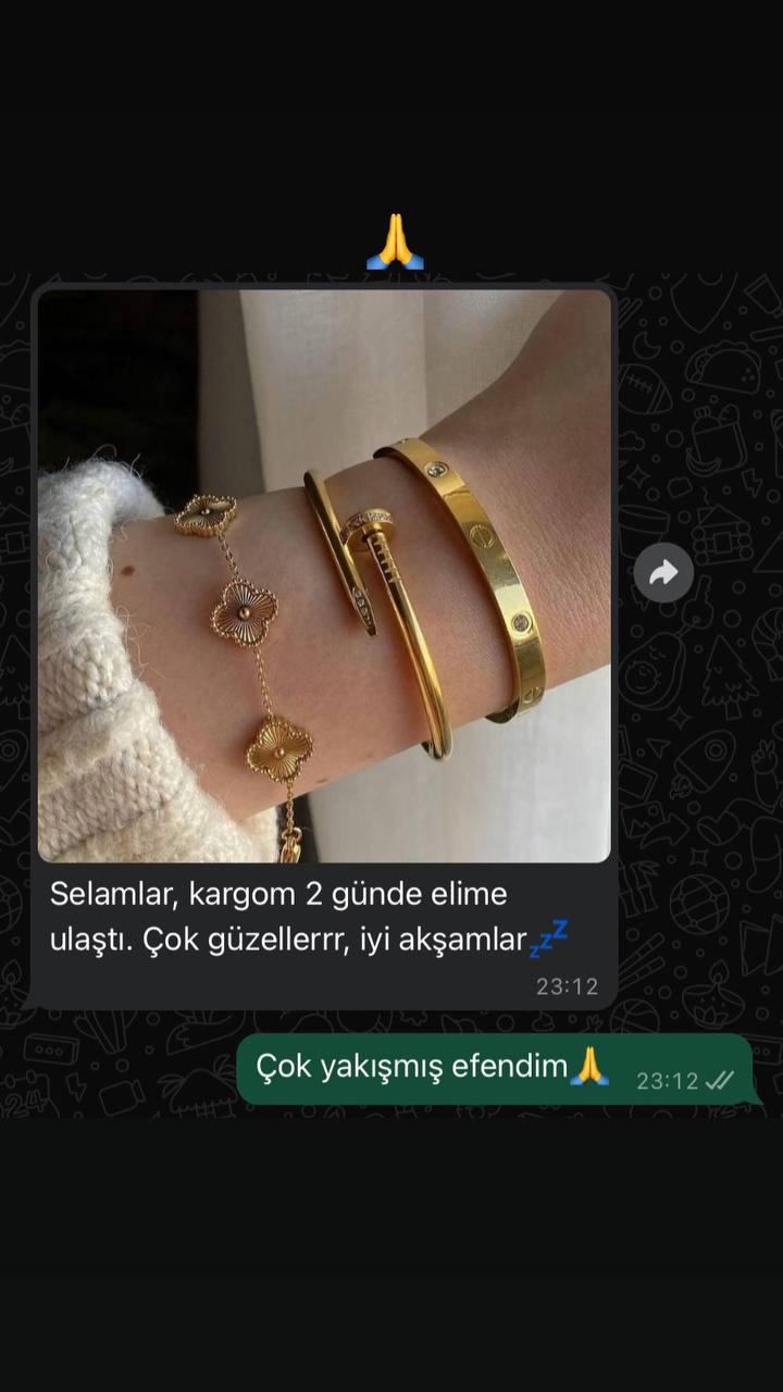 Paslanmaz çelik, gümüş ve altın kaplamadır. Dikkatli kullanımda kararma kaşıntı yapmaz.