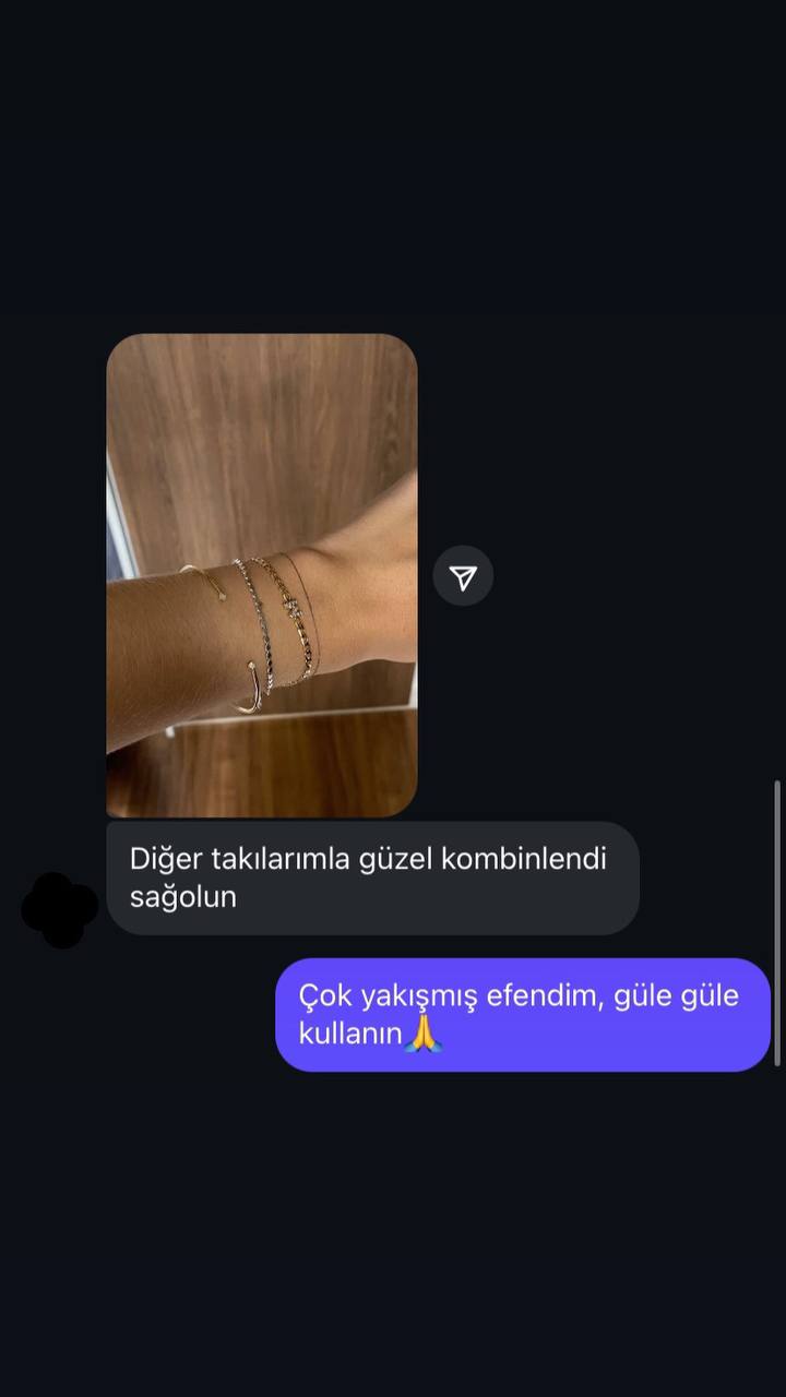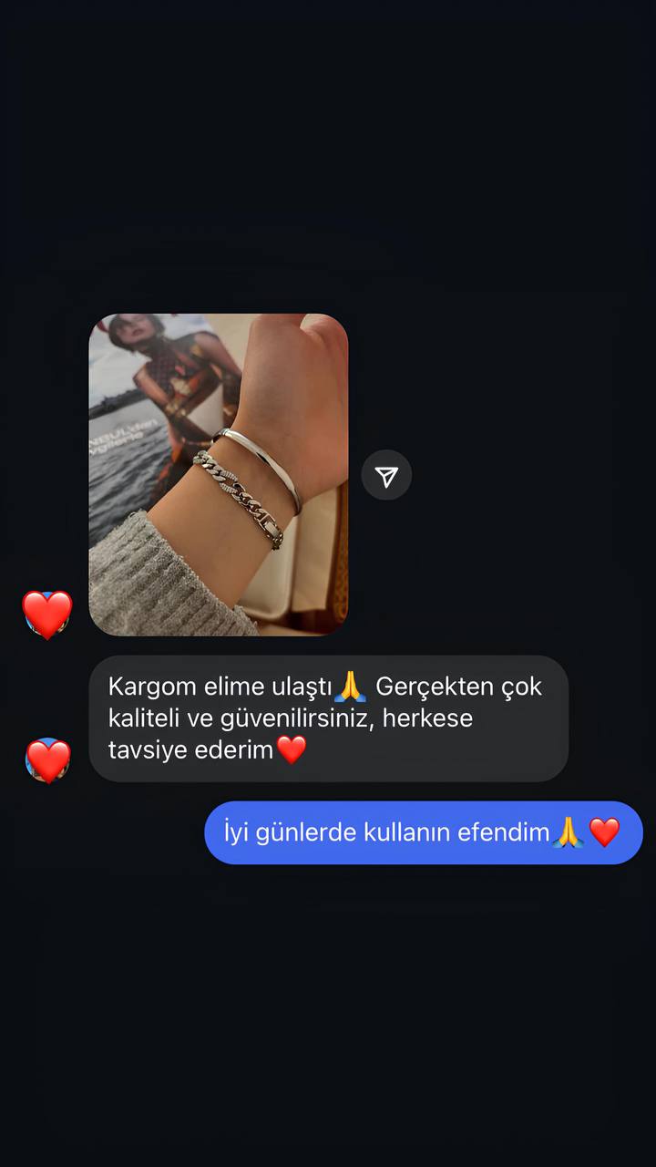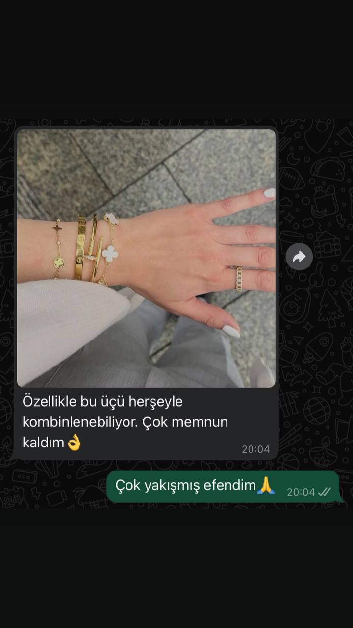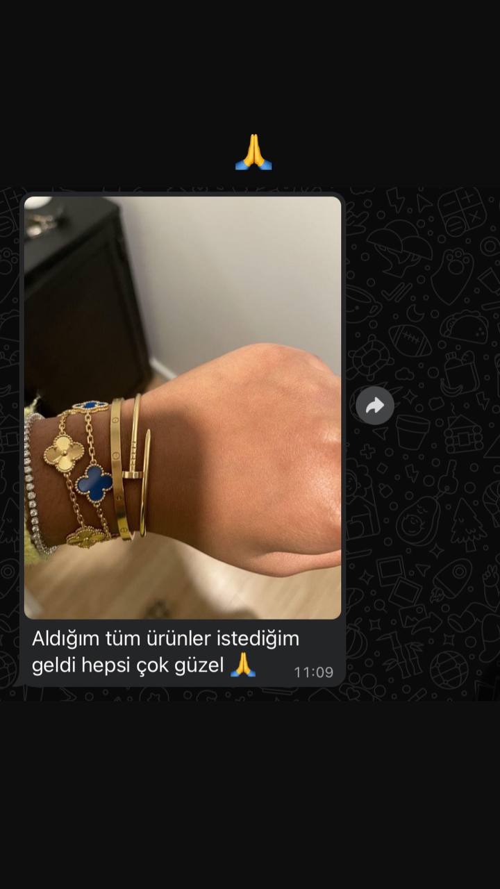 Paslanmaz çelik, gümüş ve altın kaplamadır. Dikkatli kullanımda kararma kaşıntı yapmaz.
